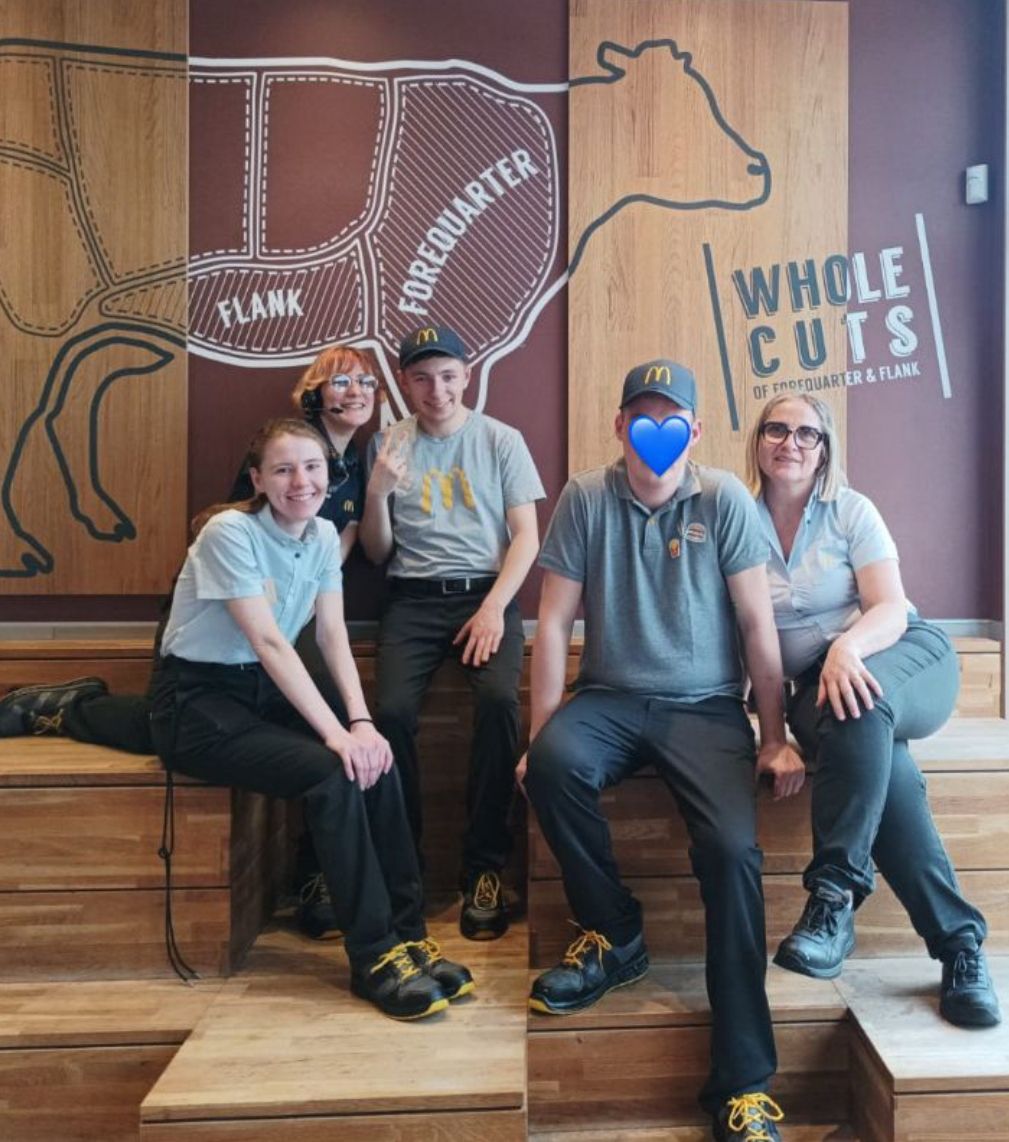 Jesolo. A destra alcuni compagni di lavoro, a sinistra la direttrice del locale in cui questo ragazzo di 37 anni sta ripartendo da zero. Che bello essere accolti dai sorrisi dei neocolleghi, ogni paura si dissolve, ogni ansia si scioglie, e va detto che con i licenziatari e con il personale dei McDonald’s l’impatto è sempre avvolgente.